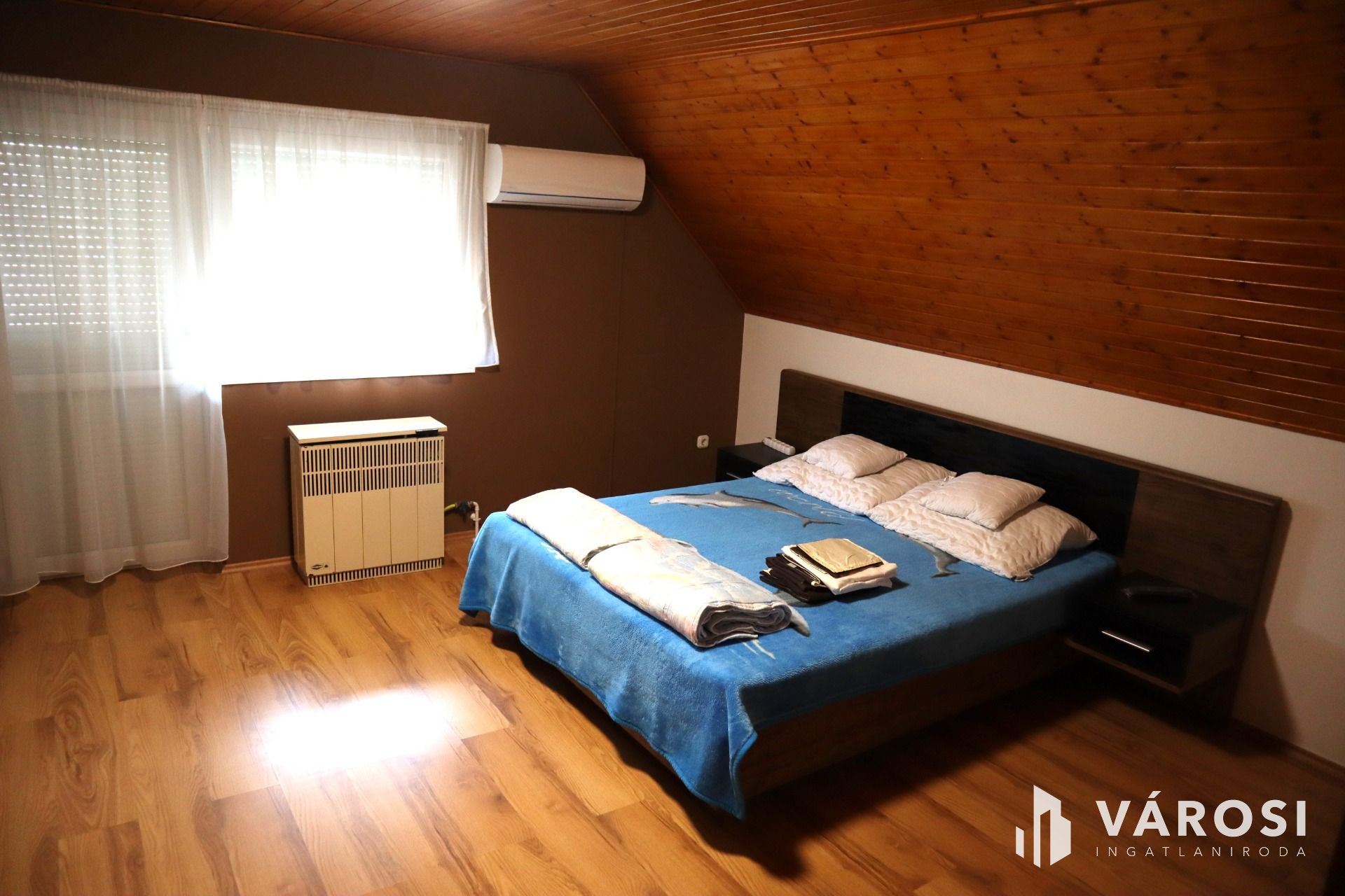 A 2004-ben épült két szintes, szigetelt tégla építésű épület hasznos alapterülete 200 m², amely egy 400 m²-es parkosított telken helyezkedik el. Az ingatlan kiváló állapotban van, a földszinten egy 100 m²-es apartman (2 hálószoba, és egy nagy nappali) az emelten pedig szintén egy 100 m²-es 3 szobás tágas apartman várja leendő új tulajdonosát. A földszinten és az emeleten is van egy konyha, és egy zuhanyzós fürdőszoba.