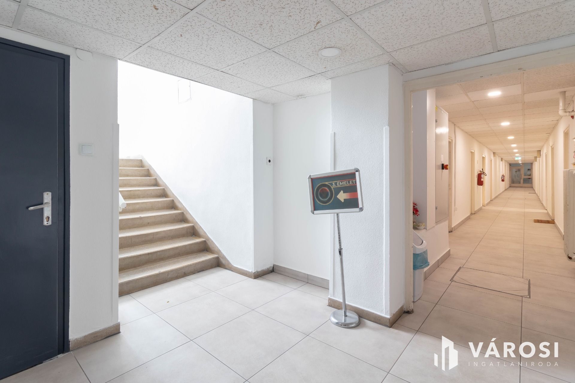 A 3 emeletes irodaépületben felújított elektromos hálózat és műanyag nyílászárók adják az irodák modernizált hátterét.