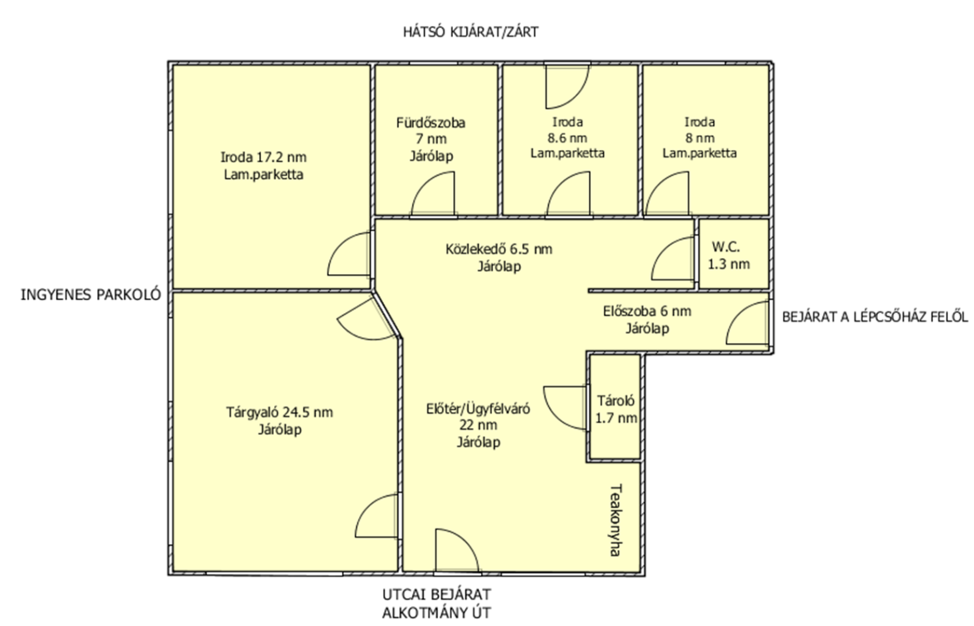 Az ingatlanban 25 nm-es tárgyaló helyiség, 3 külön bejárattal rendelkező kisebb iroda, teakonyha lehetőség, ügyfélváró/előtér, közlekedő, tároló, fürdőszoba, külön nyíló W.C./mosdó található.