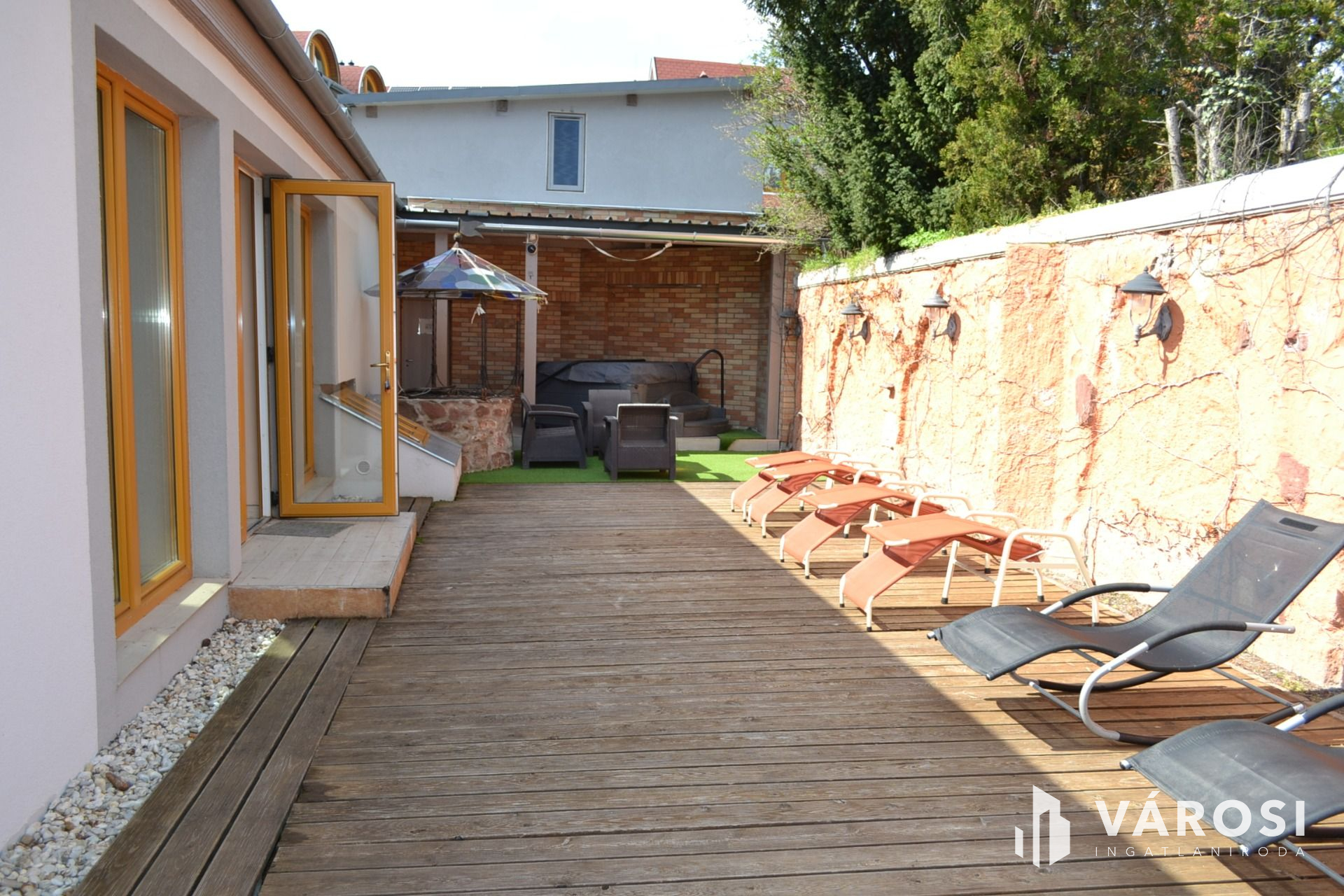 -mediterrán terasz napozóágyakkal és napernyőkkel.
