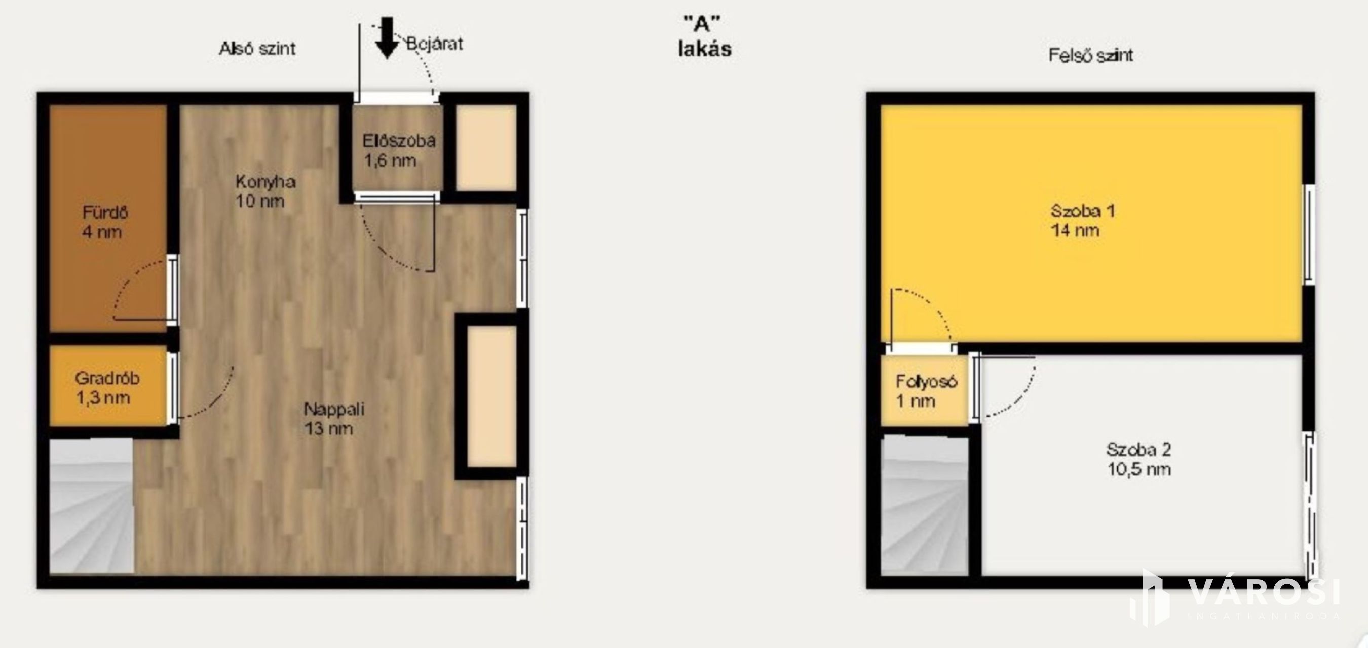 - belső lépcsővel elérhető két külön nyíló hálószobával.