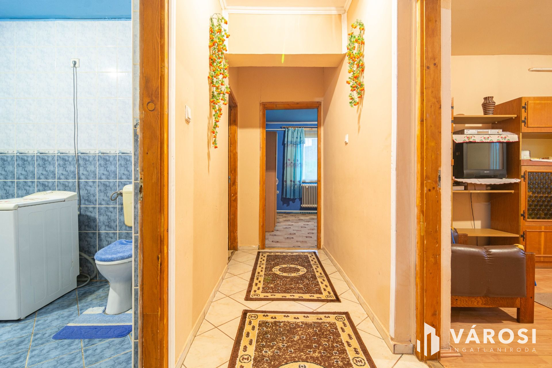 A teraszon keresztül jutunk be az előtérbe. Itt bal oldalon található egy Wc, tovább haladva pedig a nappaliba jutunk. A nappaliból nyílik a konyha és az étkező rész. Jobb oldalon a folyosón jutunk el a fürdőbe és a 3 szobába. A szobák laminált parkettával illetve padlószőnyeggel burkoltak, a többi helység burkolata csempe.