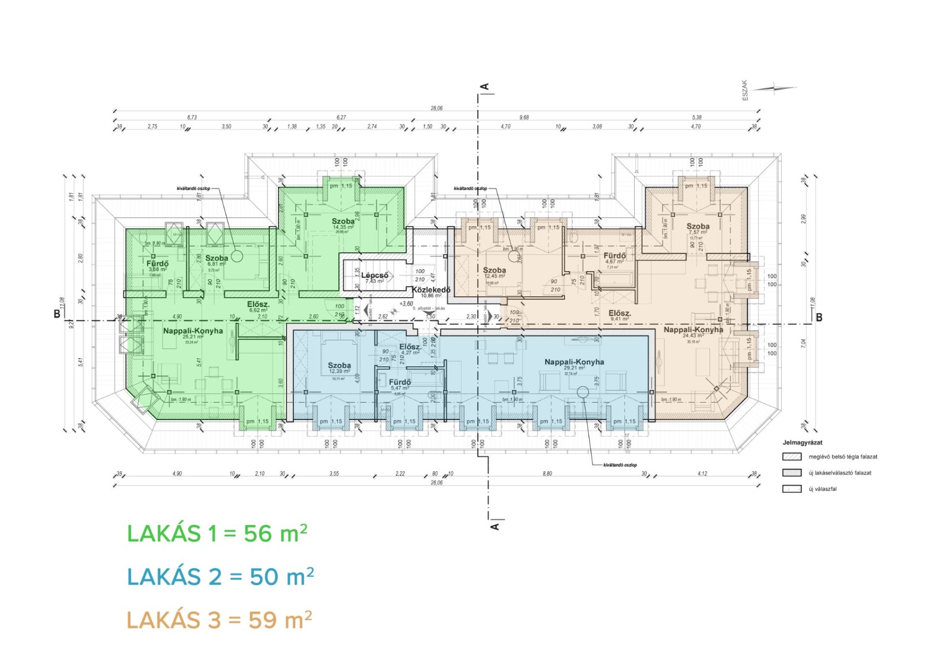 - Tetőtér = 3 db újonnan kialakított lakás (50 m2 + 56 m2 + 59 m2)