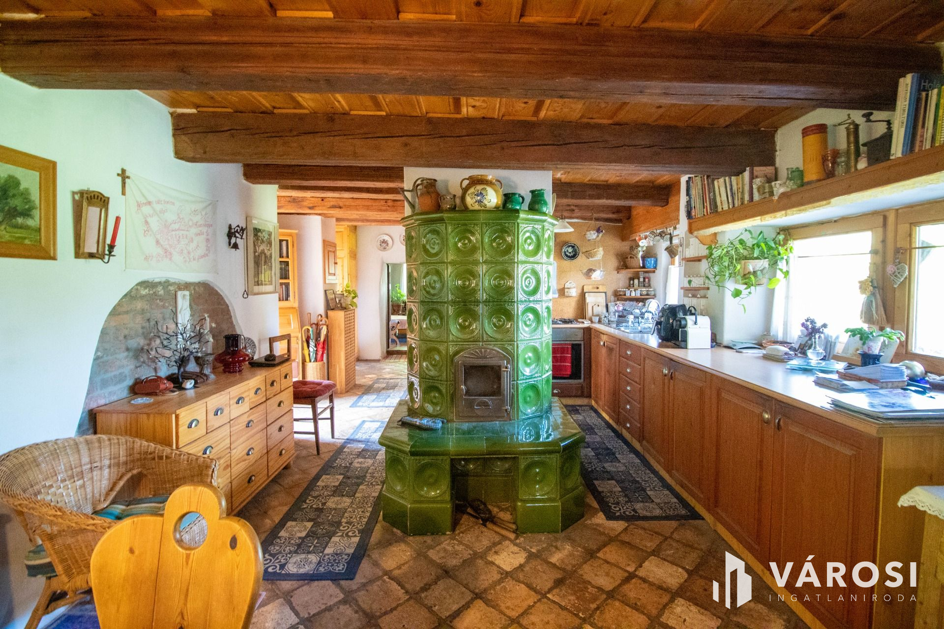 Egy a konyhában található gyönyörű cserépkályha adja a meleget és kellemes hangulatot.