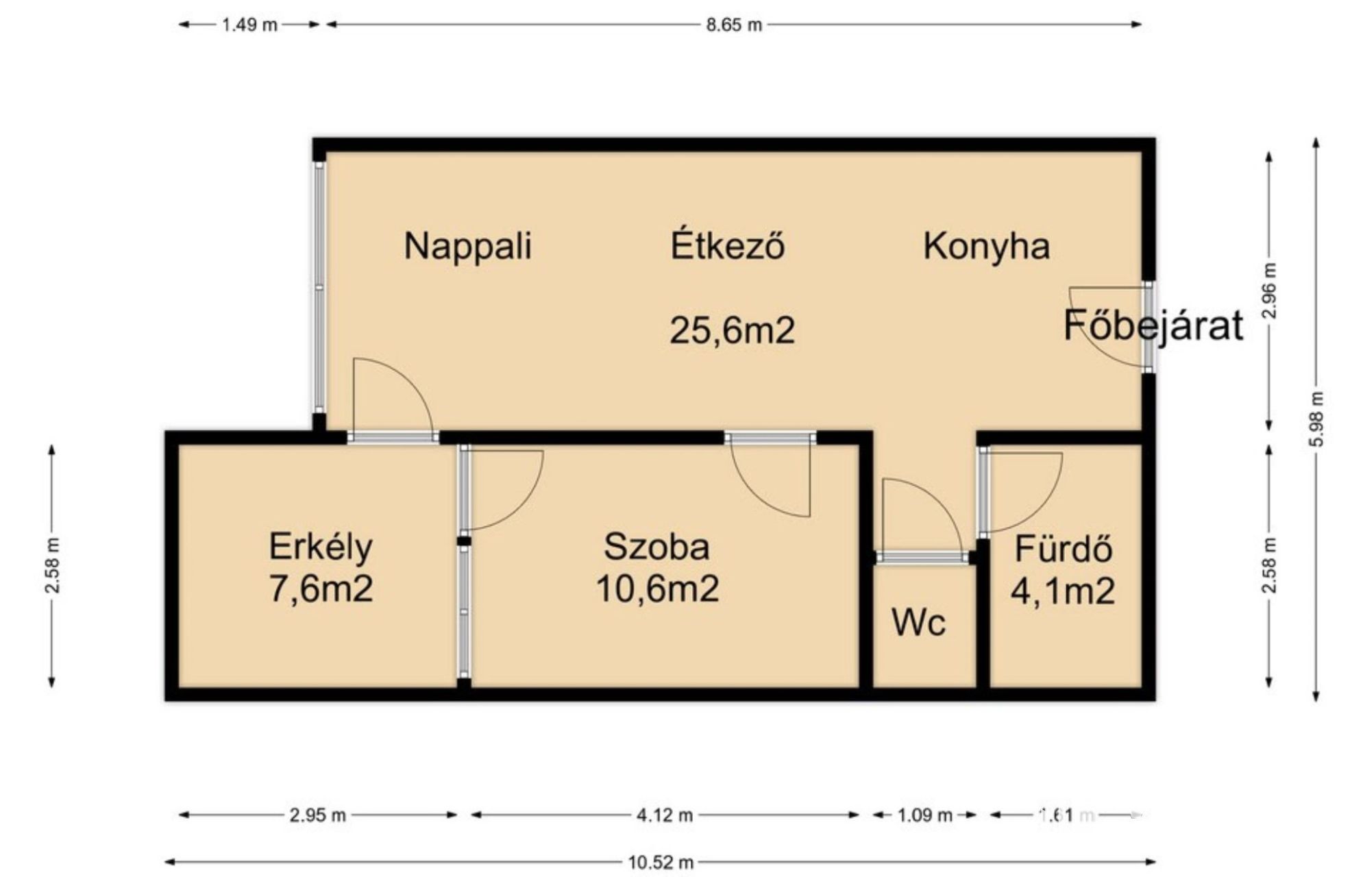 Lakrész helységei: amerikai-konyha-nappali-étkező közvetlen erkélykapcsolattal, külön fürdő, külön mellékhelység, hálószoba szintén erkélykapcsolattal.