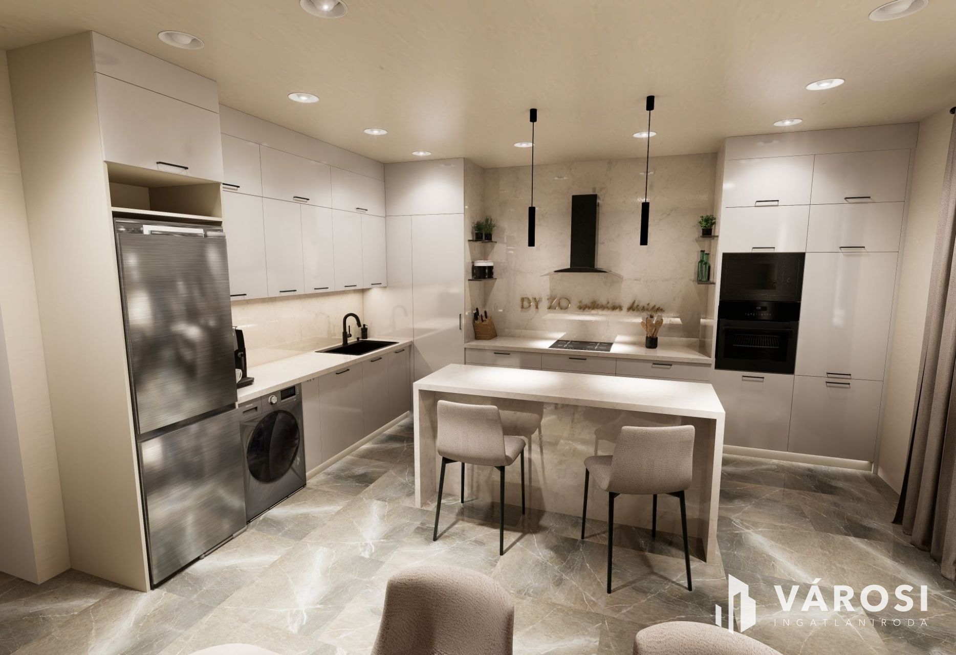 A társasházban 2 lakás került kialakításra, azonos alapterülettel és műszaki tartalommal. Egy a földszinten és egy az emeleten. A földszinti lakás, melyről a látványterek készültek 90 m2 hasznos alapterülettel rendelkezik 2+1 félszobás, teraszkapcsolatos.