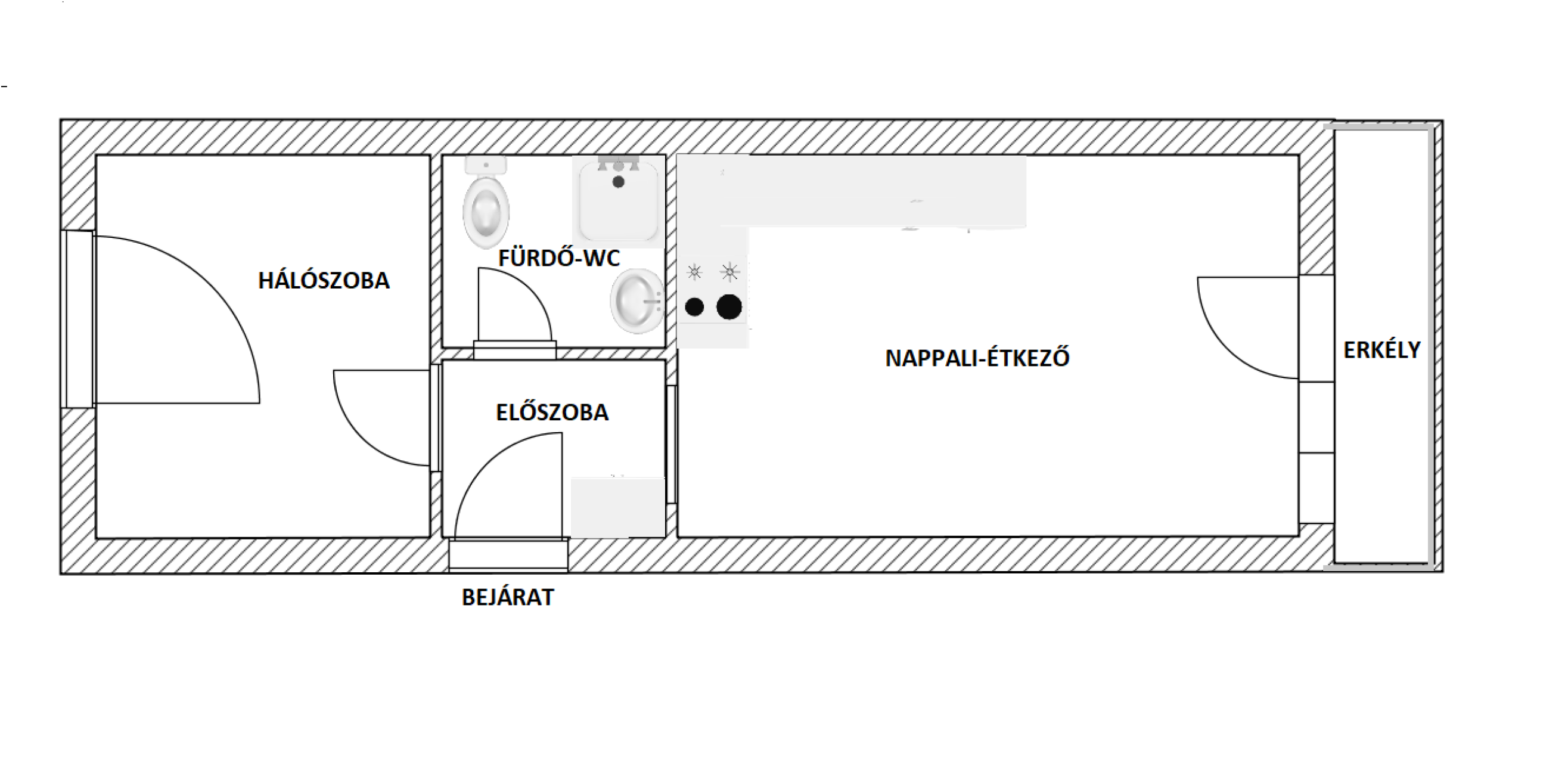 A lakás az első emeleten található, elosztása szerint: nappali-konyha-étkező, hálószoba, fürdő-wc, előszoba helyiségekből áll.