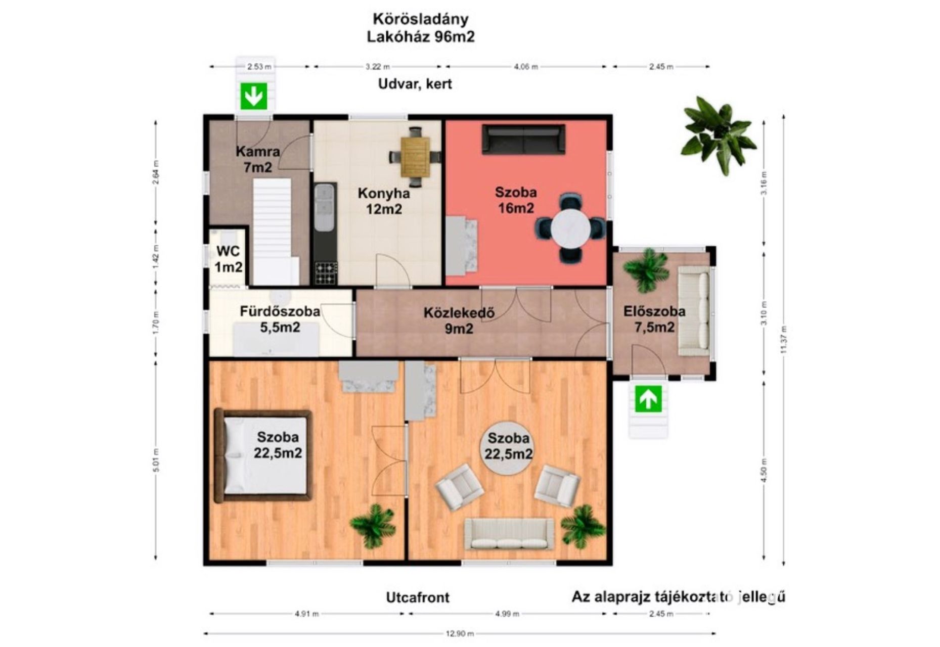+ Helyiségei: 96m2 alapterületen 3 tágas szoba, konyha, kamra, fürdőszoba, WC, közlekedő, előszoba kapott helyet.
