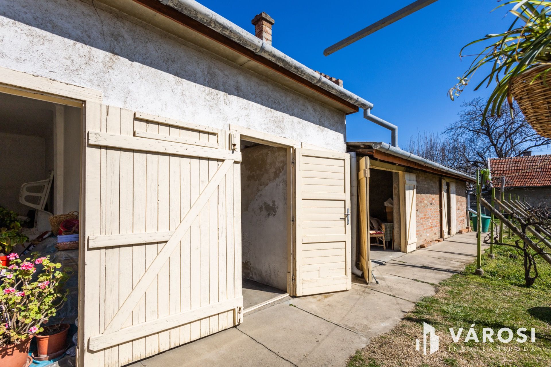 Az ingatlanhoz duplatelek tartozik, melyben egy nagy méretű melléképület is helyet kapott, ebben akár garázsnak, akár műhelynek is jut bőven hely. Az előkertnek köszönhetően a ház nem utcafronton található. A kertben számos virág mellett szőlő, ribizli és málna is helyet kapott.