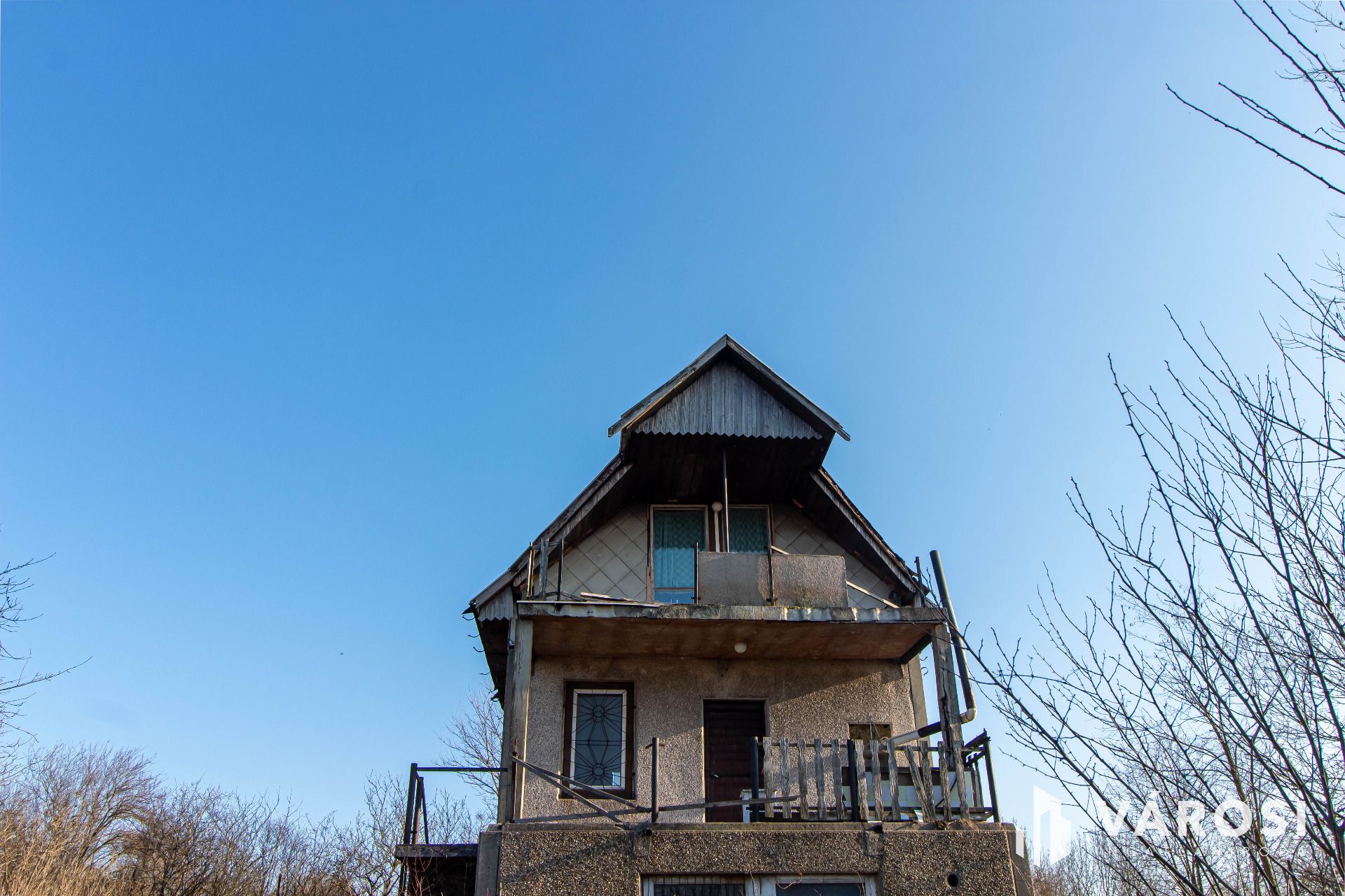 A telken egy betonelemekből épült, háromszintes épület található, amely a 80-as évek óta áll a területen. Az épület teljes felújítást igényel, viszont jó alapot adhat egy hangulatos hétvégi ház kialakításához. A ház kb. 30 m²-es, és három szintből áll: egy szuterén szintből, egy földszinti helyiségből, amelyhez kb. 6 m²-es terasz kapcsolódik, valamint egy tetőtéri szintből, amelyhez egy kb. 4 m²-es terasz tartozik. A felső teraszról szép panoráma tárul elénk, ami igazán különleges hangulatot ad a helynek.