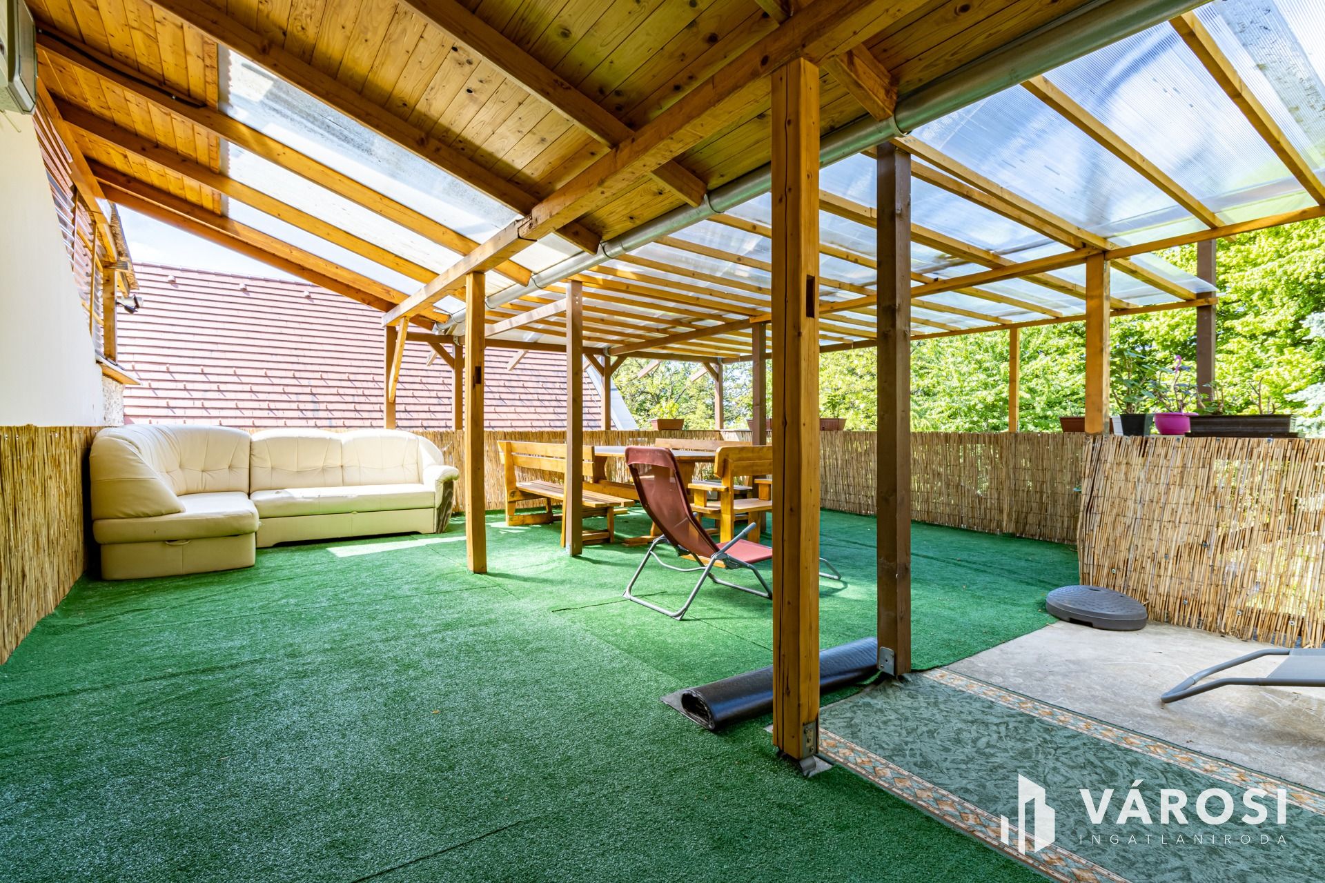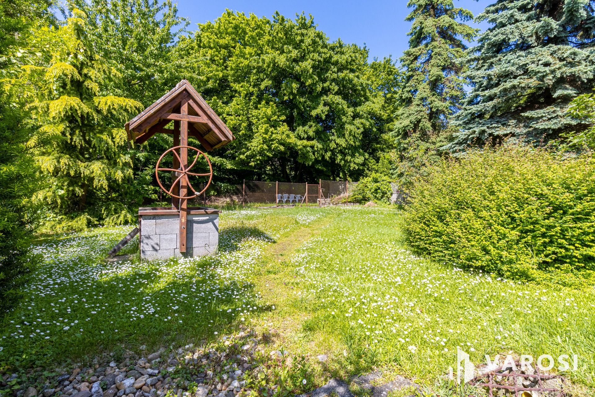 A ház egy 957 m²-es telken helyezkedik el, amely ideális méretű: könnyen karbantartható, mégis élhető kert. A telek hátsó részén egy kis patak csörgedezik.