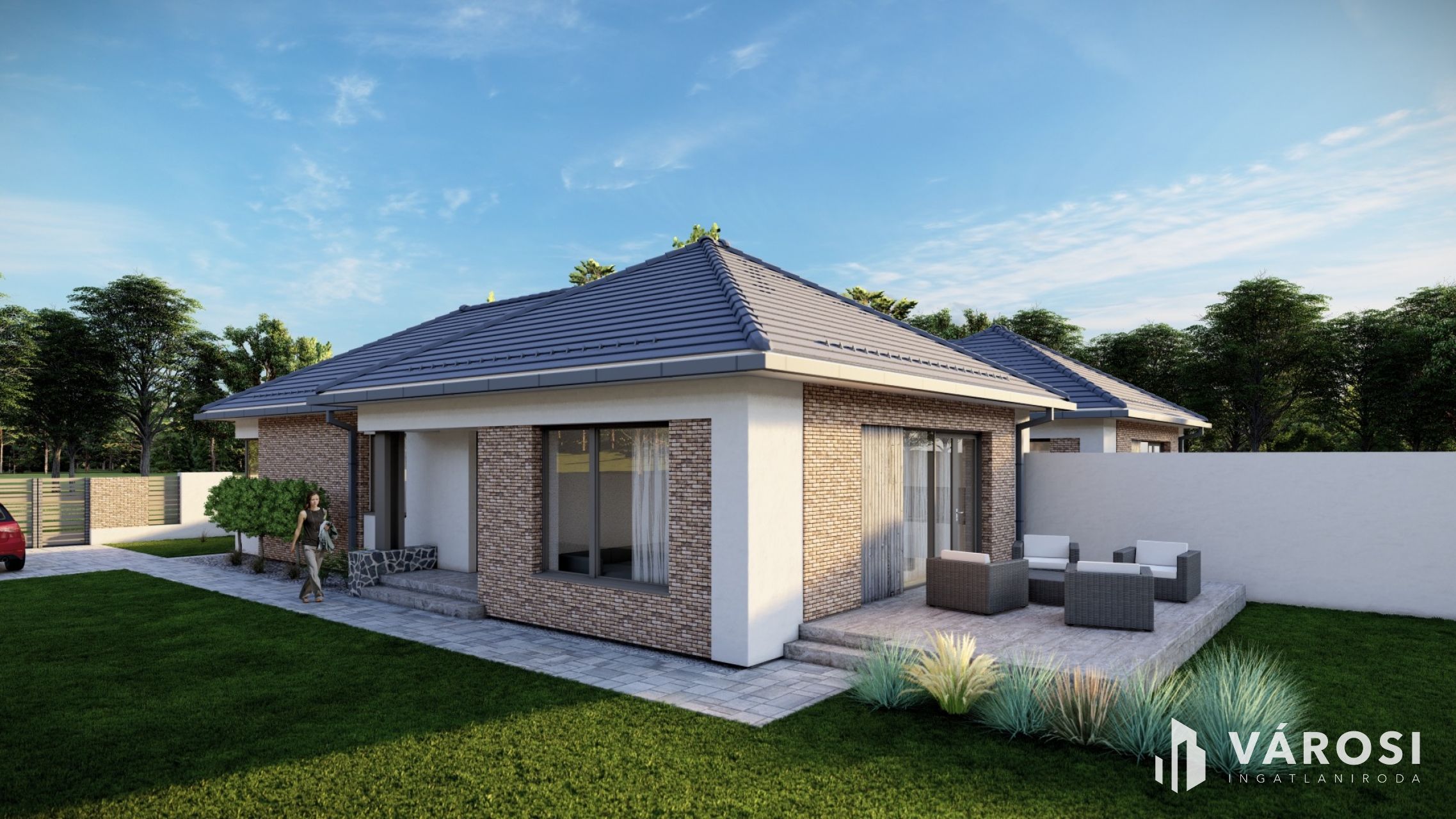 A házban tágas amerikai konyhás nappali + 3 kényelmes szoba, gardrób, valamint külön fürdő és WC kap helyet.