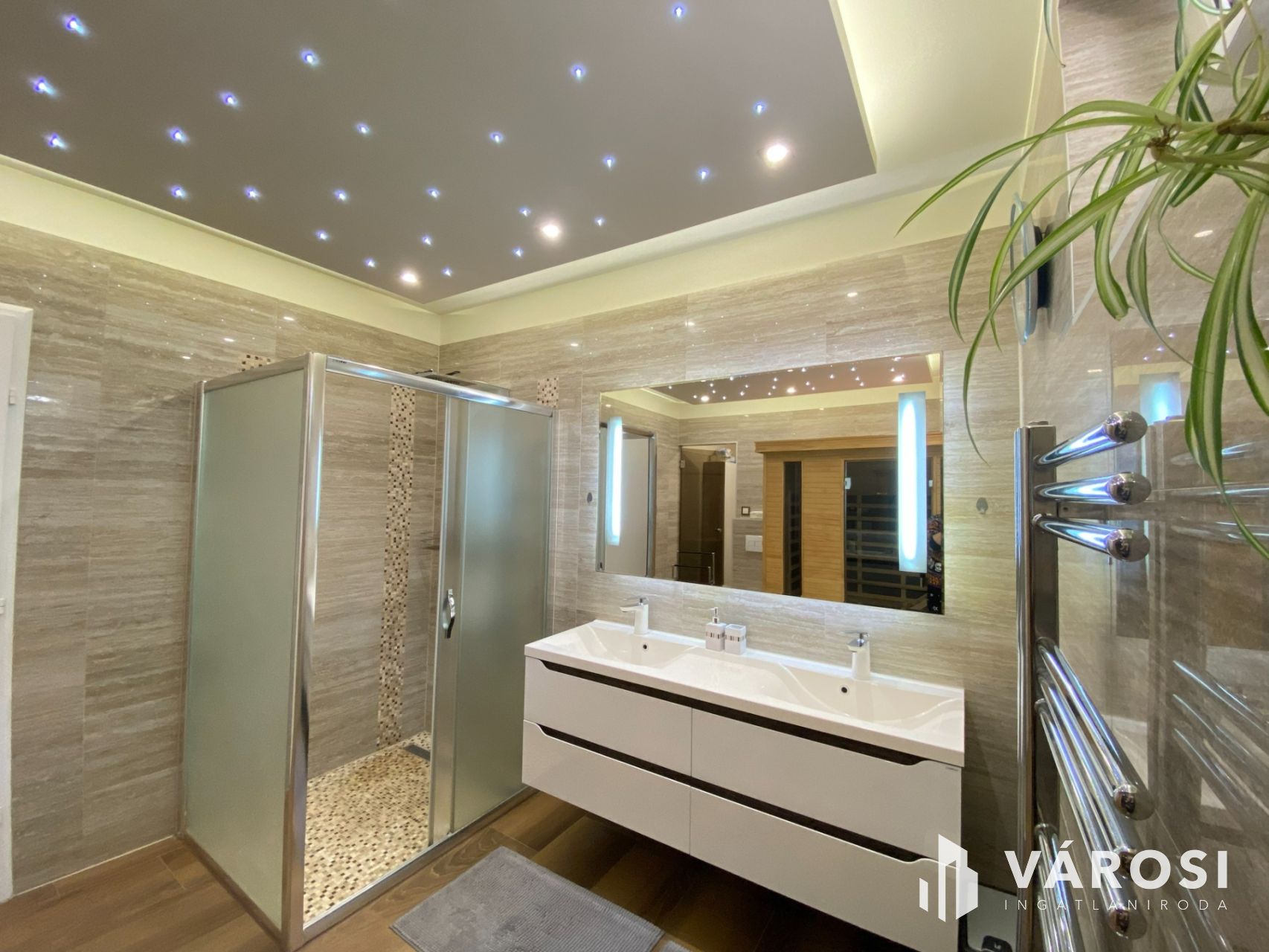 A ház központi része az amerikai konyhás nappali, amely méretéből adódóan valódi élettérként működik, ráadásul a kandalló még otthonosabb hangulatot ad. A földszinten négy külön nyíló szoba található, valamint két zuhanyzós fürdőszoba és egy infraszauna is helyet kapott, így akár nagyobb család vagy több generáció együttélése esetén is jól használható.