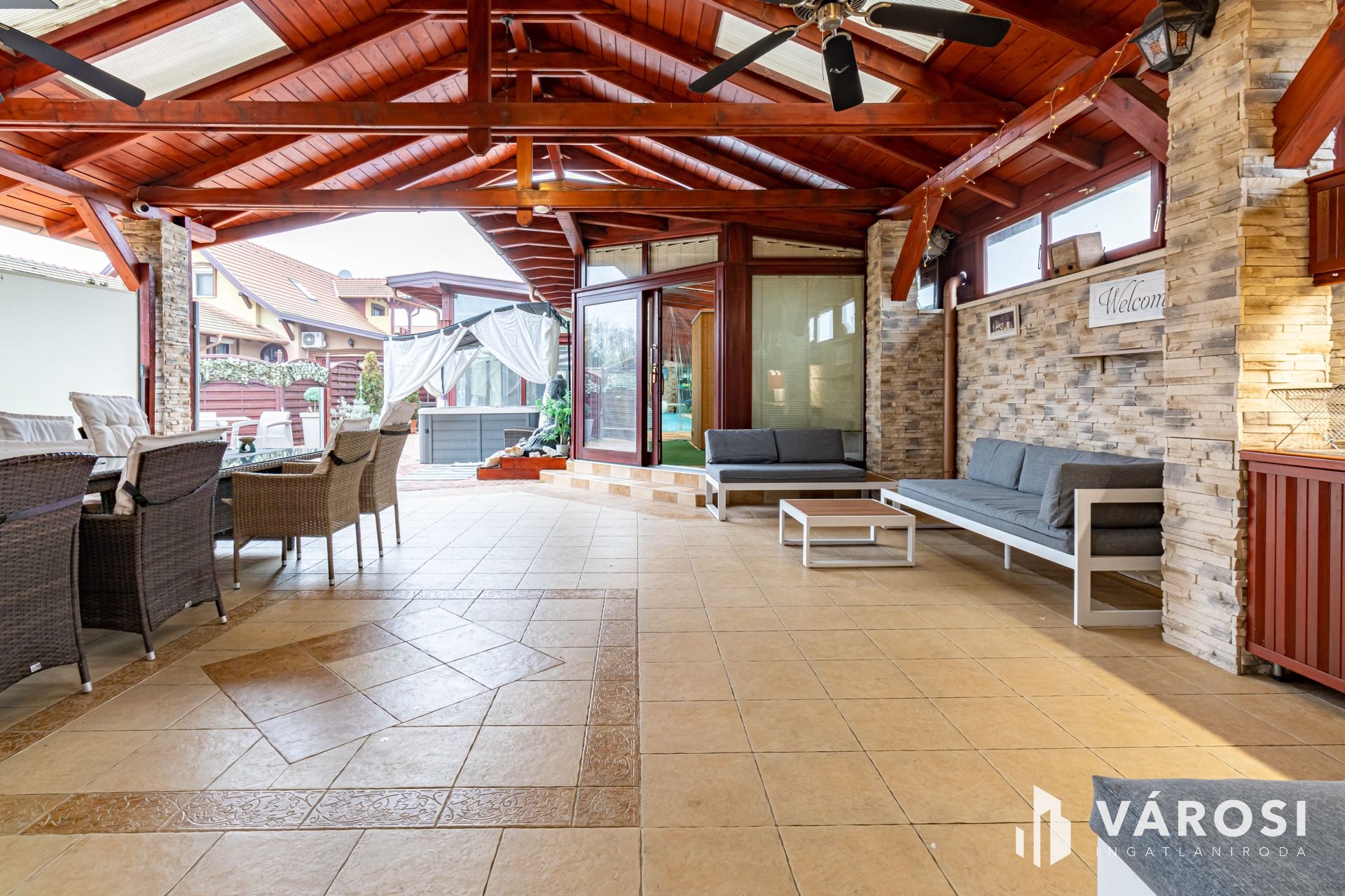 A házhoz rendezett udvar, több autó parkolására alkalmas kerti beálló, elektromos kertkapu, kerti sütögető, napozóágyak illetve egy hatalmas fedett terasz is tartozik, ami egy teljesen felszerelt kinti konyhát és pihenő helyeket is magában foglal. Gyakorlatilag, mintha nyaralna.